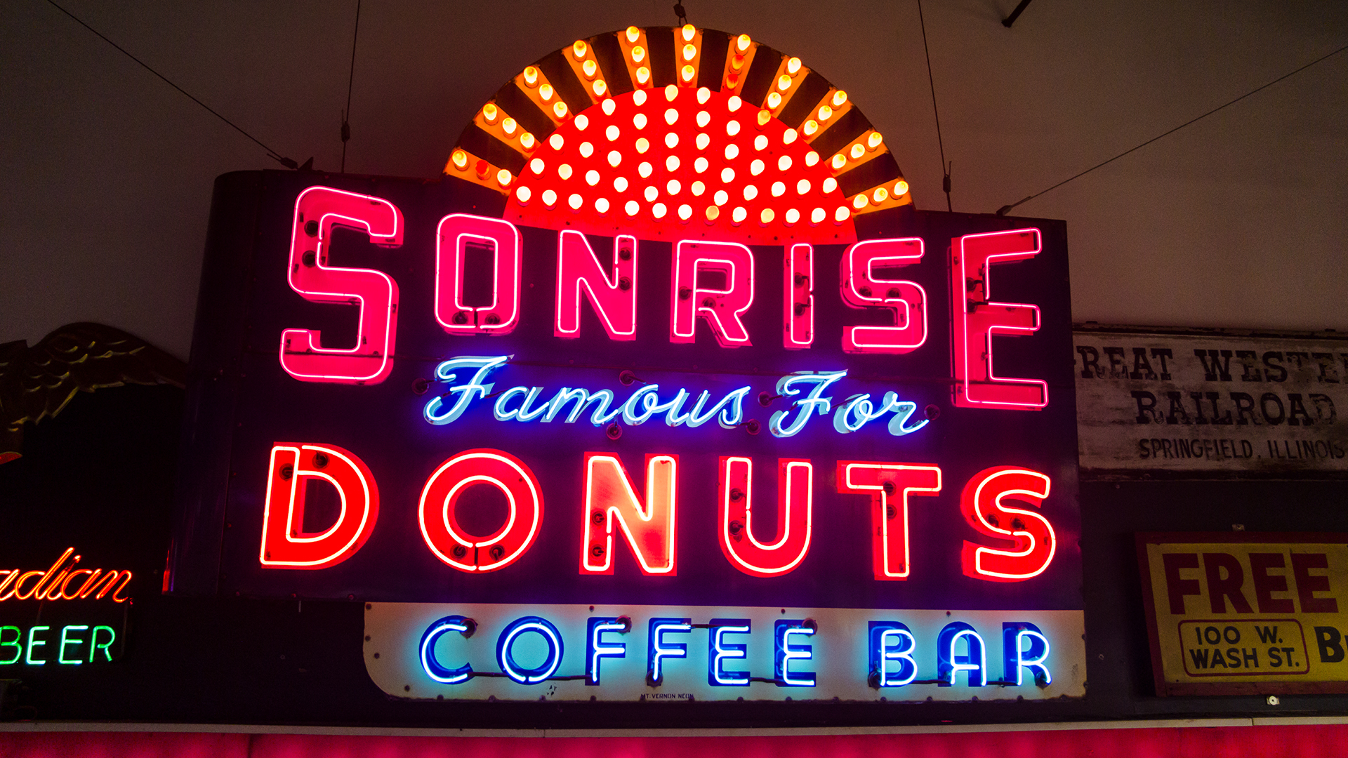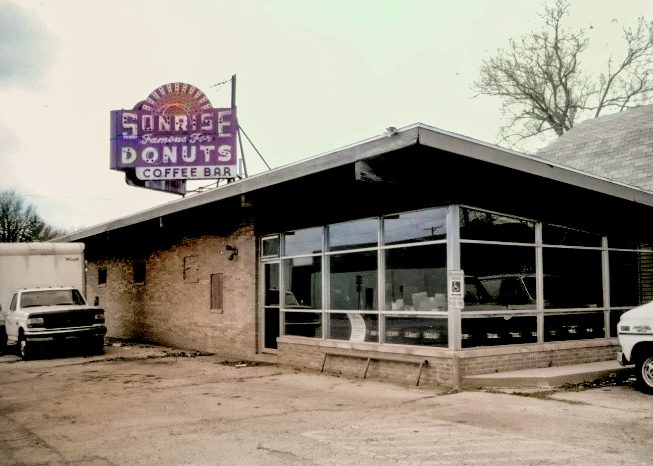 Sonrise Donuts, with its unusual spelling, was founded in 1947 by Byron Figuera with a donut shop that opened on Route 66 at 1101 S Ninth Street in Springfield. After two years in business, the now iconic, double-sided V-shape 6' x 8' porcelain sign with traditional lighting and neon was erected on its rooftop. In 1967, employee Don "Donuts" Greenslade, bought the business from Byron after working for him for 14 years. At one point it was said that Greenslade made 400 varieties of doughnuts every day until he died in 1998. Sadly, the business closed shortly after that. Various eateries would occupy the space here and there in the decades that followed. In 2018, a Mexican restaurant that occupied the location asked the landlord to remove the Sonrise Donut sign as it confused its customers.